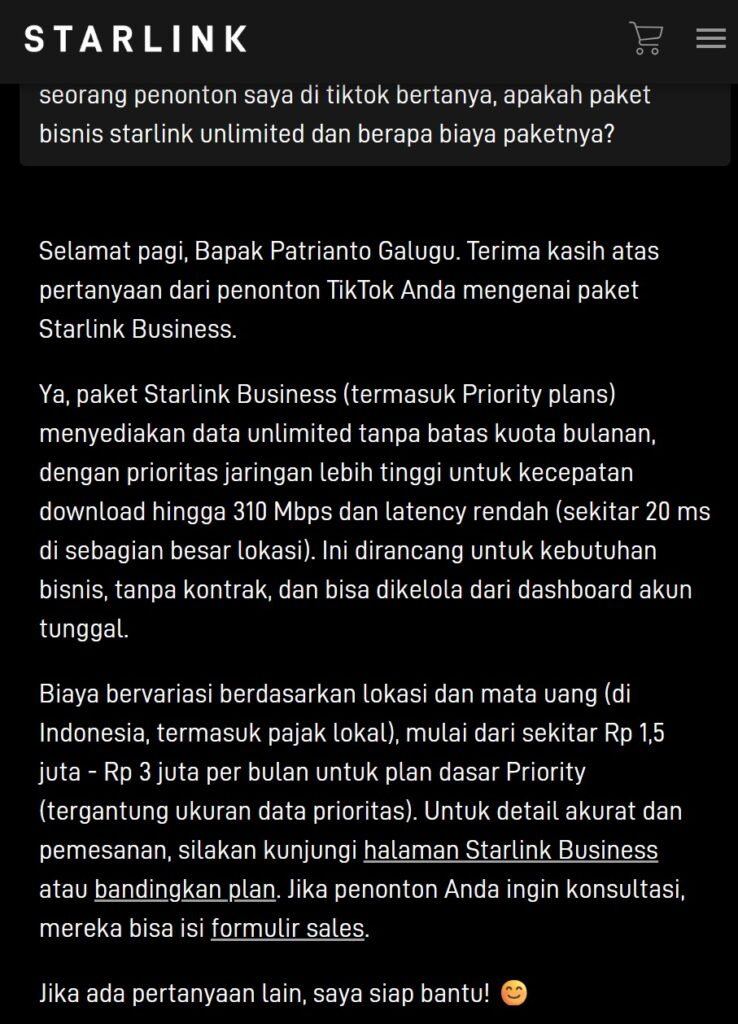 Berikut adalah tangkapan layar, jawaban dari Starlink, saat saya menanyakan pertanyaan kak lusiani Hura.