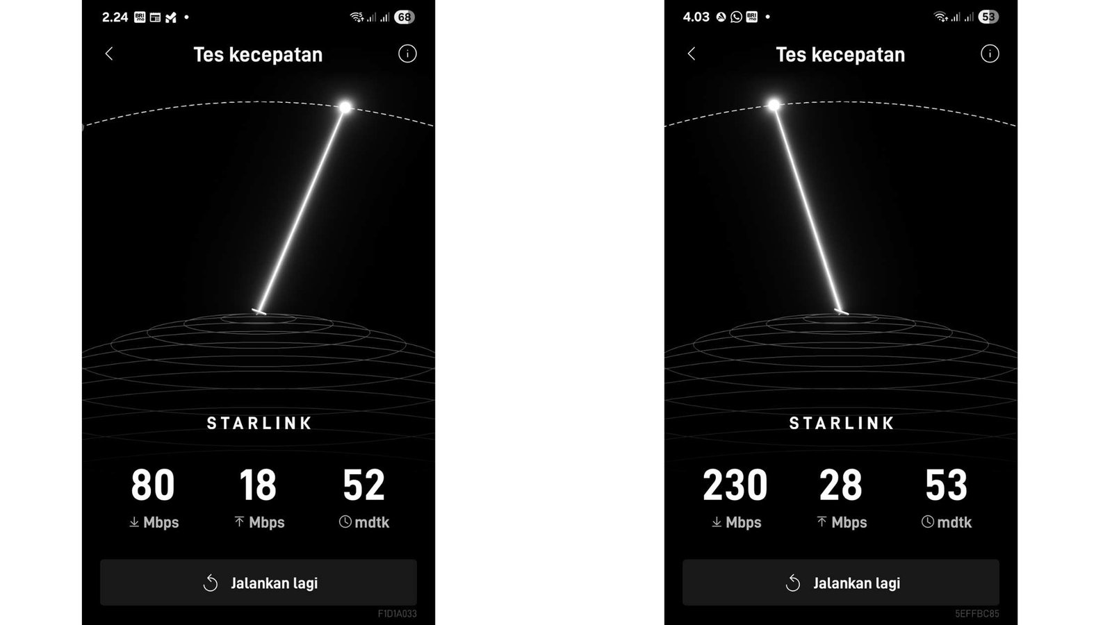 Pada Sabtu, 13/9/2025, berikut adalah kecepatan Starlink Mini, berdasarkan pada jam tertentu yang saya screenshot langsung dari aplikasi Starlink saya.